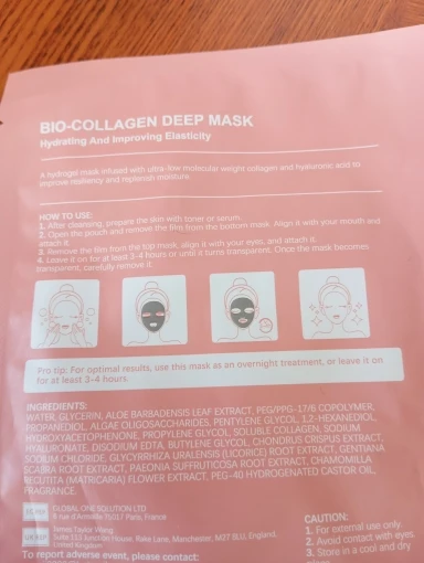 Kelly Schaden The mask has a moisturizing and lifting effect. It consists of 2 parts that are too small for the face. There is a gap in the middle. The area for the lips and eyes needed to be trimmed. Incomprehensible design. Requires effort when applying. It does not fully absorb but dries and leaves a film.